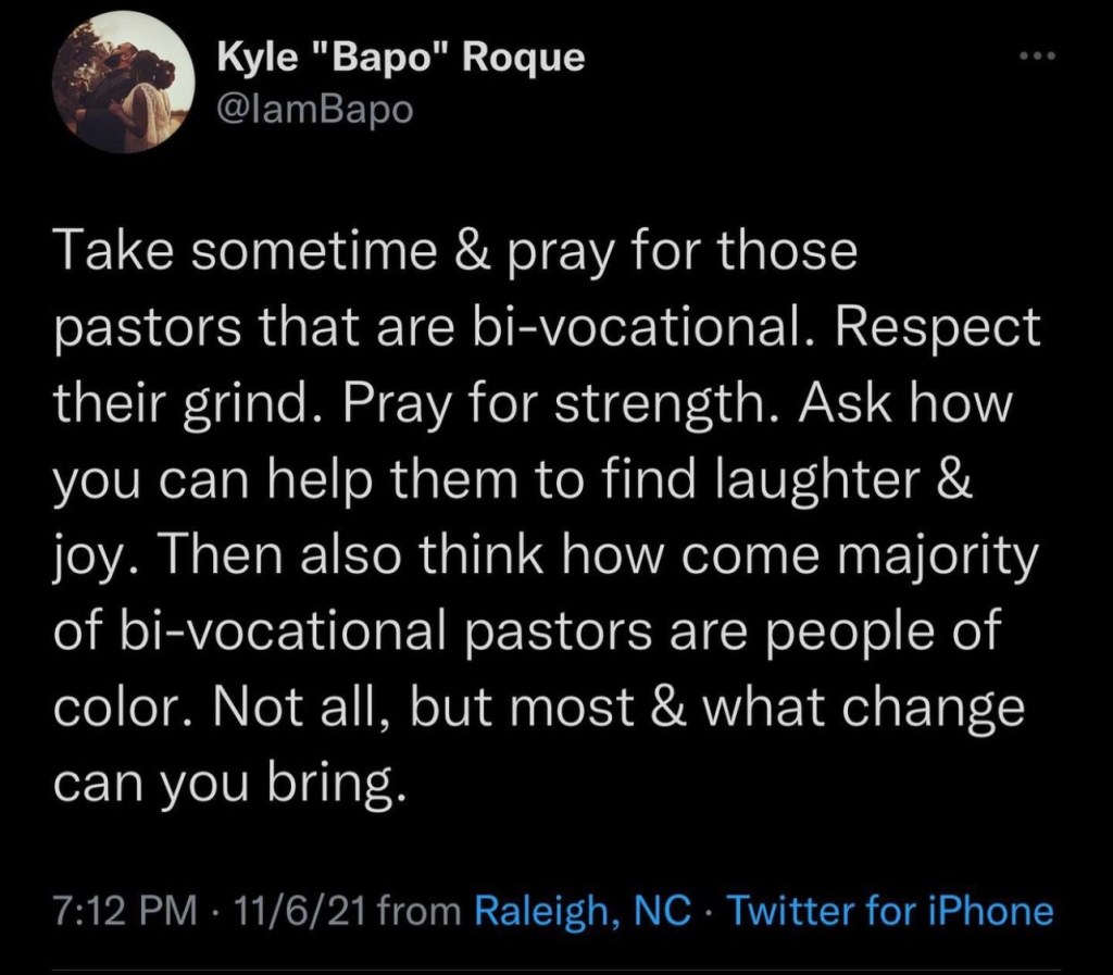 “Man bro… that hits home!” is what a friend messaged me after seeing a post I shared on Instagram that mentioned how most bi-vocational pastors are of color. Peep the story!